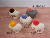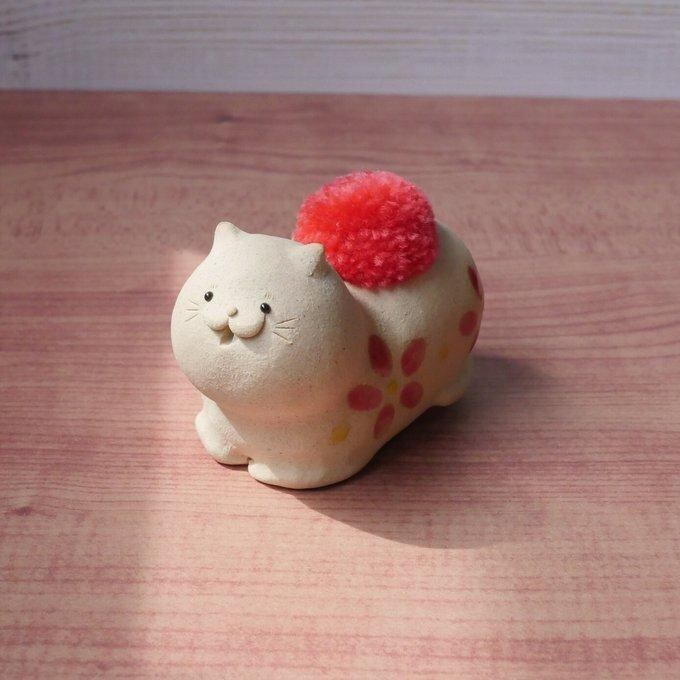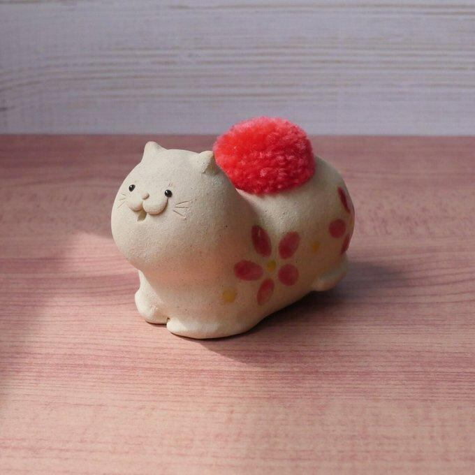 陶器猫「ねこのひげ枕」香箱座りタイプ 親ねこ 赤花柄です。