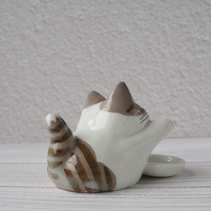 オリジナル陶器猫「ねこのひげ枕」招き猫タイプ 茶サバ ブチ 丸目